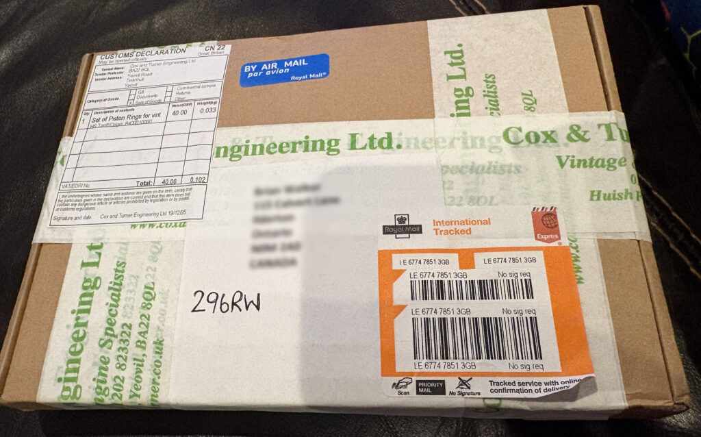 Fortunately, coxandturner.co.uk still have another set in stock (email went out quickly). By sheer coincidence (and a generous interpretation of planning), my wife and daughter are heading to the UK on Saturday for a holiday visit. The new rings will be shipped to her mum’s place and smuggled back across the Atlantic before the New Year, wrapped in festive goodwill and mild mechanical regret.