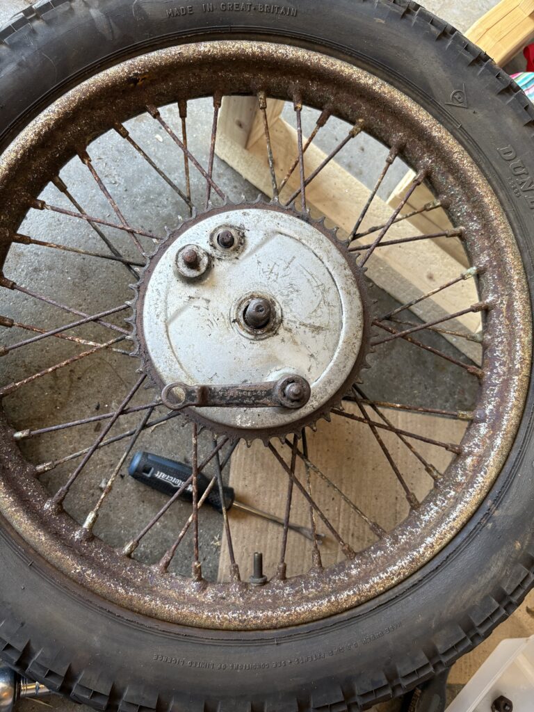Even though it’s rusty and is still holding Scottish air inside the wheel is just sliding along the ground now. Likely occurred after using the brake pedal (which by the way is on the left foot and not the right foot like Canadian motorcycles :o) ). My guess is that something has seized in the old drum brakes and so this is a must to repair for the first phase.