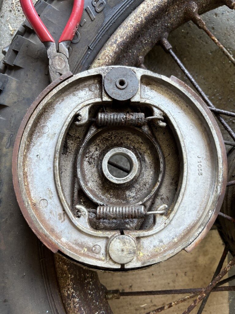 After re-assembly the brake drums were properly being expanded to engage and stop the wheel. The pads seemed fine and so just a general clean up so that the bike is workable for now.