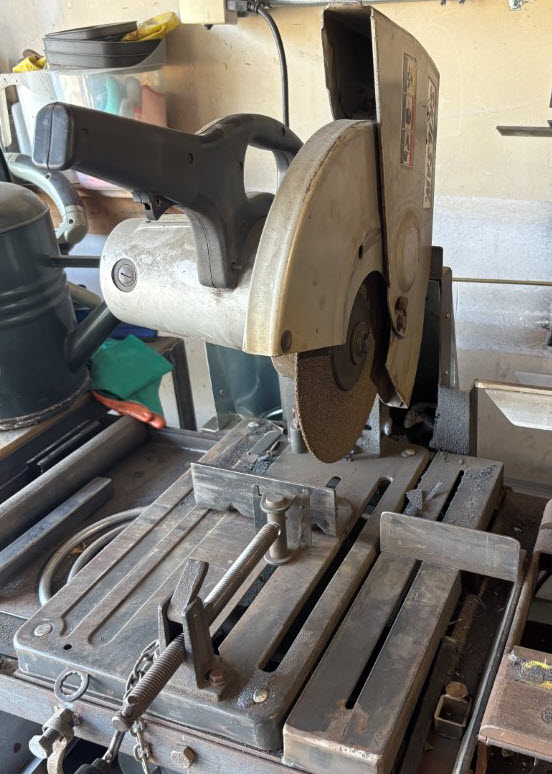 Tool of the day was at my neighbors. I had a metal chop saw for a while, but sadly it was James’ and so it’s no longer in my Garage. I setup and measured all the pieces I’d need from the 6 24″ lengths of 1″ sq tube.