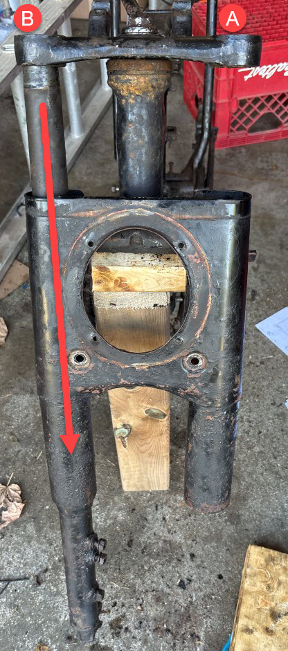The bolt holding on (B) to (A) was a bolt and nut but it passed through a tube which was pressed in through the two side arms as well as through the core Frame. I found a screw that had a head which was just smaller than the frame but the thread went into the tube. I used this to drive the tube out using a screwdriver and 5# mallet (persuader) while supporting the back and applying heat with my electrical heat gun. — Success