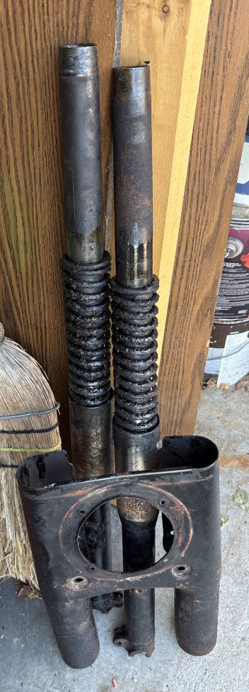 Per Doug’s suggestion I will take the nuts removed earlier from the tops of the tubes and use them to remove the suspension tubes. I will thread them back in down to the bottom and then back them out just 1 thread to keep maximum thread engagement. I can then use a piece of hardwood on top and pound them down (proper assembly support) to push them out of the taper wedge. This can be done for each and should help remove them from the assembly.