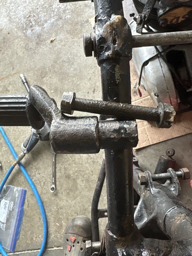 In this photo I placed the swing arm spindle back in the swing arm and placed in on the frame to show where it would pass through. You can see the single grease nipple which is offset and might struggle to push grease to both bronze bushings.