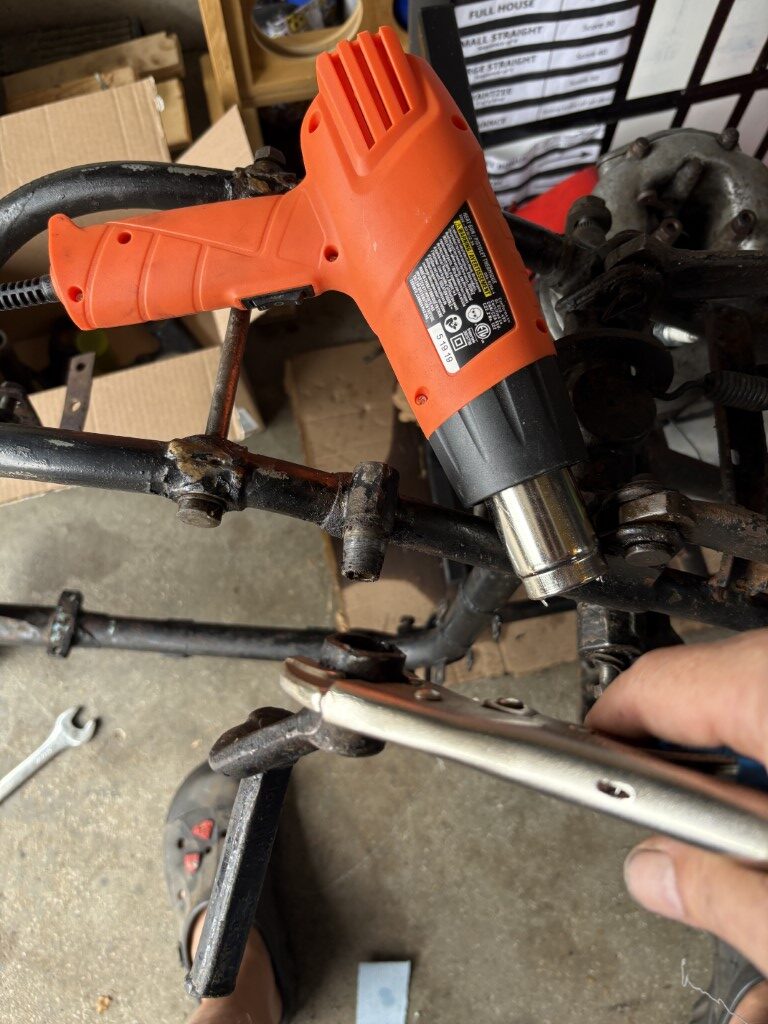 Enter the heat gun. Not the kind of blowtorch you see in proper garages—no, this was the Princess Auto shrink-wrap special. Normally used for scaring plastic electrical tubing into submission, today it was promoted to “fire-breathing dragon.” A little heat, a twist with the vice grips, and—presto—it surrendered without another whack. The BFH sat sulking in the corner, muttering about “how things used to be done.”