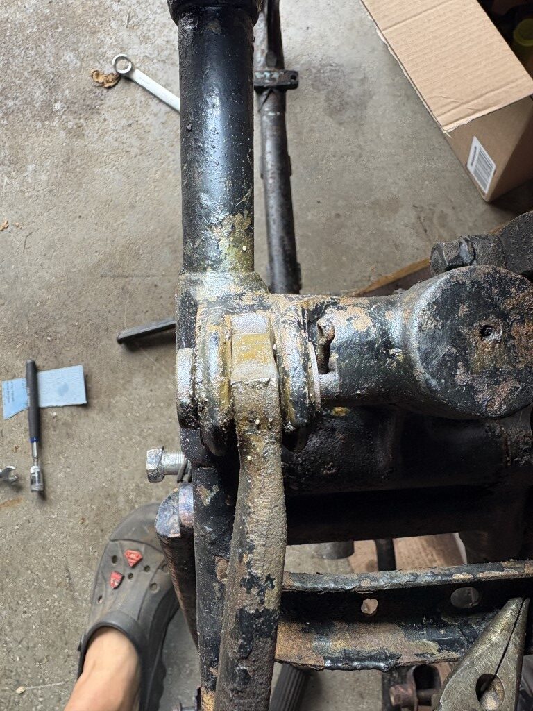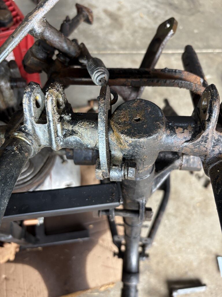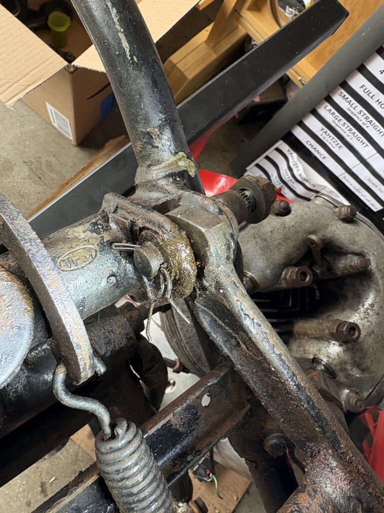 The brake-side foot peg and lever were a bit kinder. The foot peg nut turned out to be reverse thread (thank heavens for small mercies). The brake pedal, though, came with its own bag of tricks. One wee nut had a cotter pin that had rusted in place—took more finesse than a Glaswegian trying to eat soup with chopsticks. There is also the brake-light switch which is going to need some love and attention.. wonder if it was working in the end… at first glance I’d guess not.